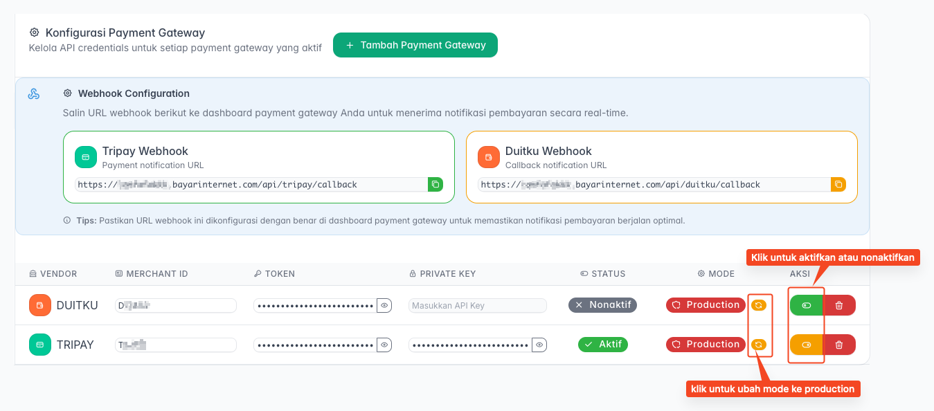 Setelah berhasil ditambahkan, pastikan status payment gateway Tripay Anda Aktif dan modenya adalah Production. Anda dapat mengaktifkan atau menonaktifkan payment gateway sesuai kebutuhan.