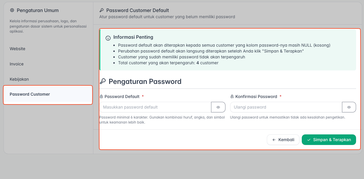 Catatan: Pastikan Anda telah menginformasikan password default ini kepada pelanggan baru atau pelanggan yang terdampak agar mereka dapat masuk (login) ke dalam sistem.