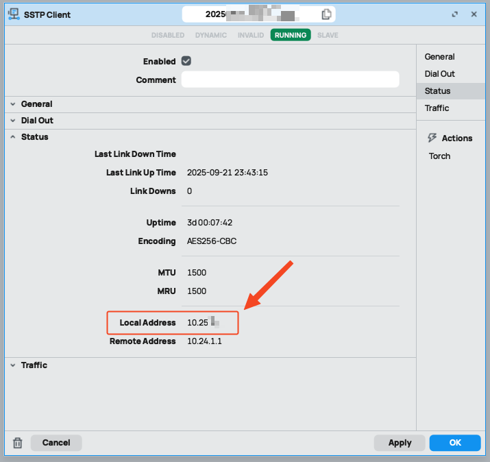 Klik dua kali pada interface tersebut untuk membuka detailnya, lalu pindah ke tab Status. Catat atau salin Local Address yang didapatkan. Alamat IP ini akan digunakan untuk menghubungkan aplikasi billing ke Mikrotik Anda.
