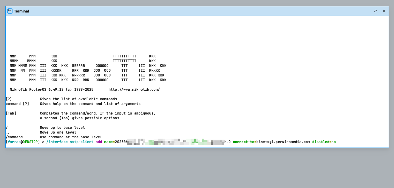 Buka aplikasi Winbox dan hubungkan ke perangkat Mikrotik Anda. Buka New Terminal dan paste script yang telah Anda salin sebelumnya, lalu tekan Enter. Perintah ini akan secara otomatis membuat interface SSTP client baru.
