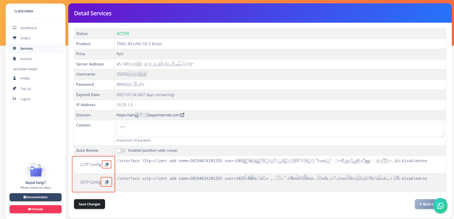 Buka halaman detail layanan Anda di portal my.perwiramedia.com. Di halaman ini, Anda akan menemukan script konfigurasi yang sudah disiapkan untuk L2TP atau SSTP. Salin (copy) script yang ada di bagian SSTP Config.
