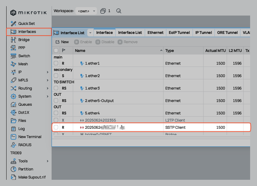 Setelah script dijalankan, buka menu Interfaces. Anda akan melihat interface SSTP Client baru dengan status "R" (Running).