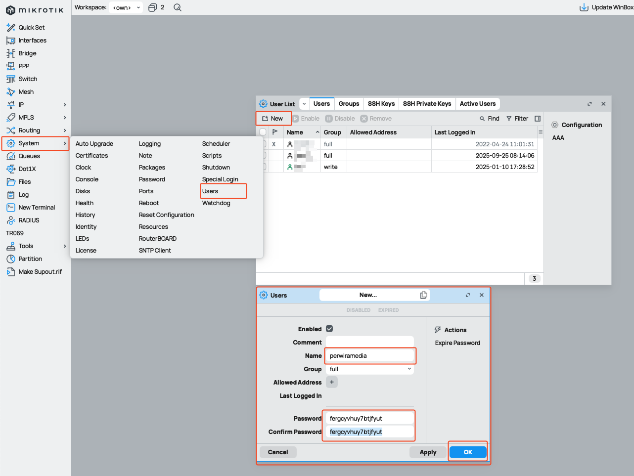 • Di Winbox, buka System > Users.