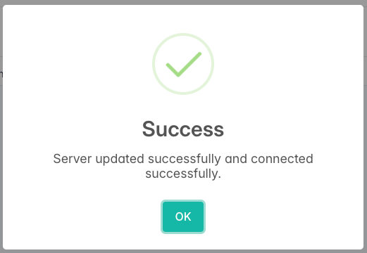 Klik tombol + Tambah Server, lalu konfirmasi penambahan. Jika semua data benar, akan muncul notifikasi "Success" dan status server di daftar akan menjadi Terhubung.