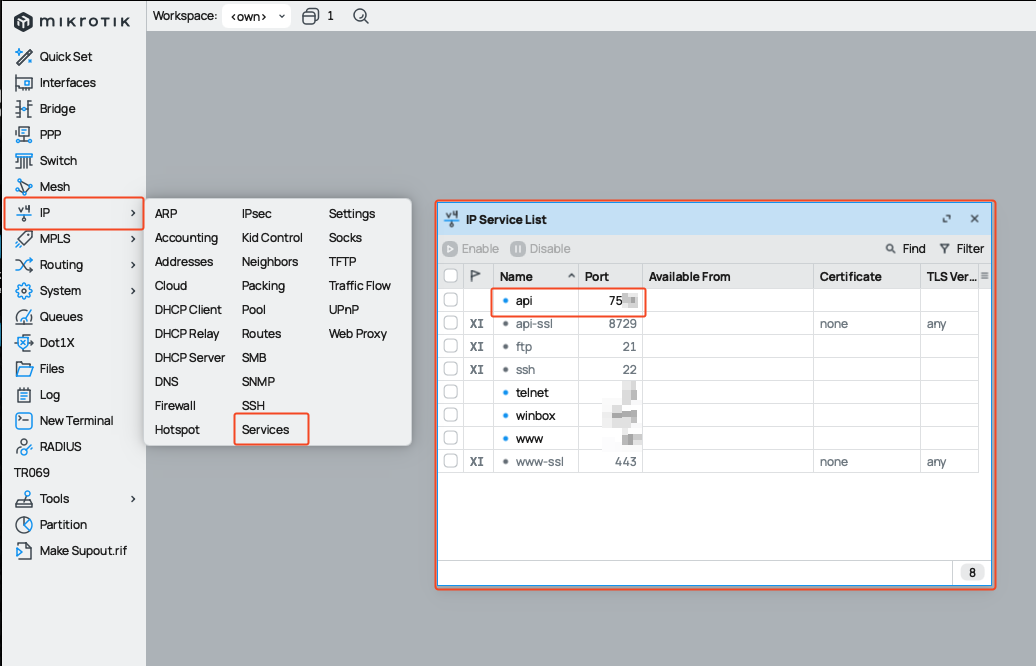 Pastikan layanan API di Mikrotik Anda aktif. Di Winbox, buka IP > Services. Cari layanan bernama api, pastikan port-nya adalah 8728 (atau sesuai custom Anda) dan tidak dalam keadaan disabled. Jika nonaktif, klik untuk mengaktifkannya (Enable).