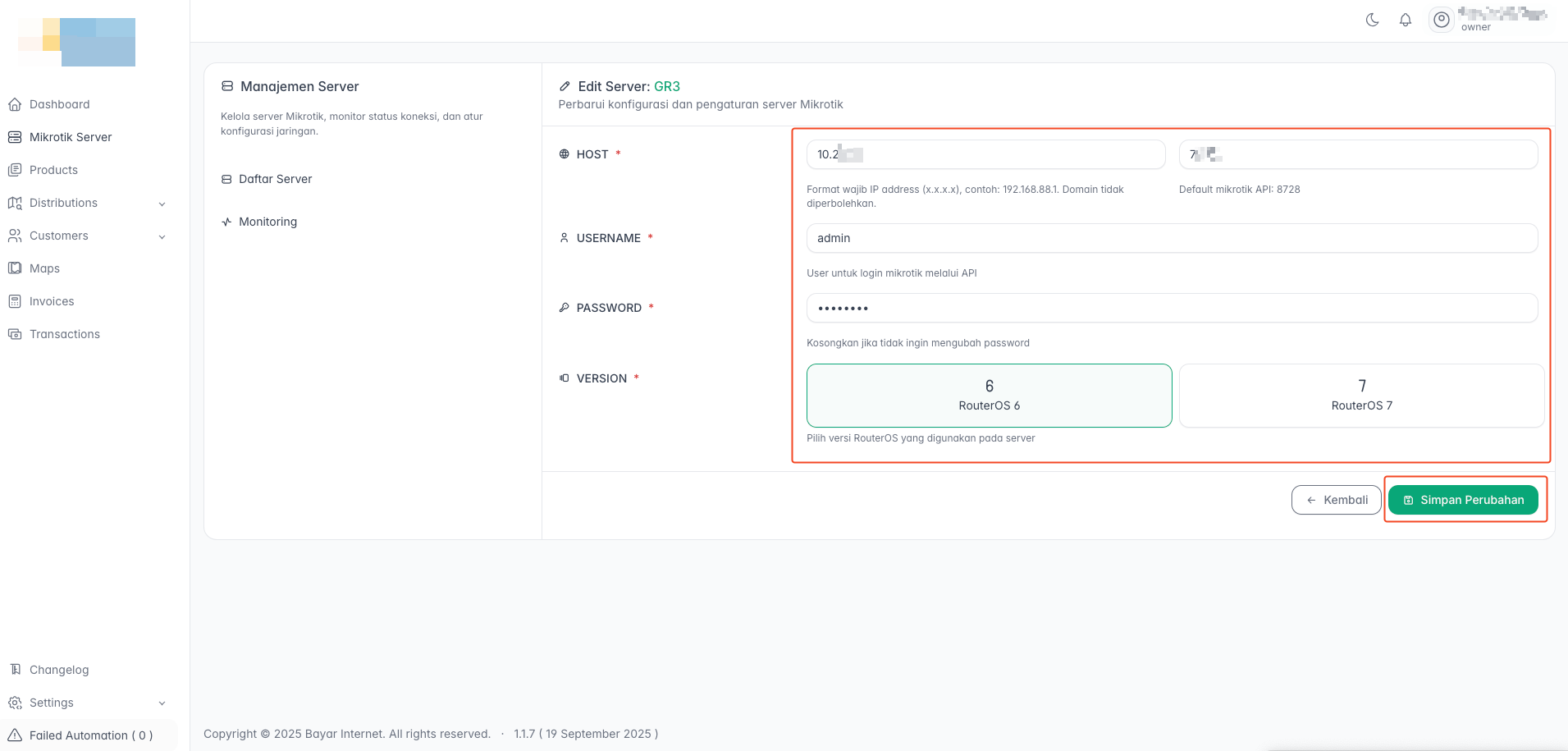 Kembali ke form Tambah Server Baru di aplikasi billing: