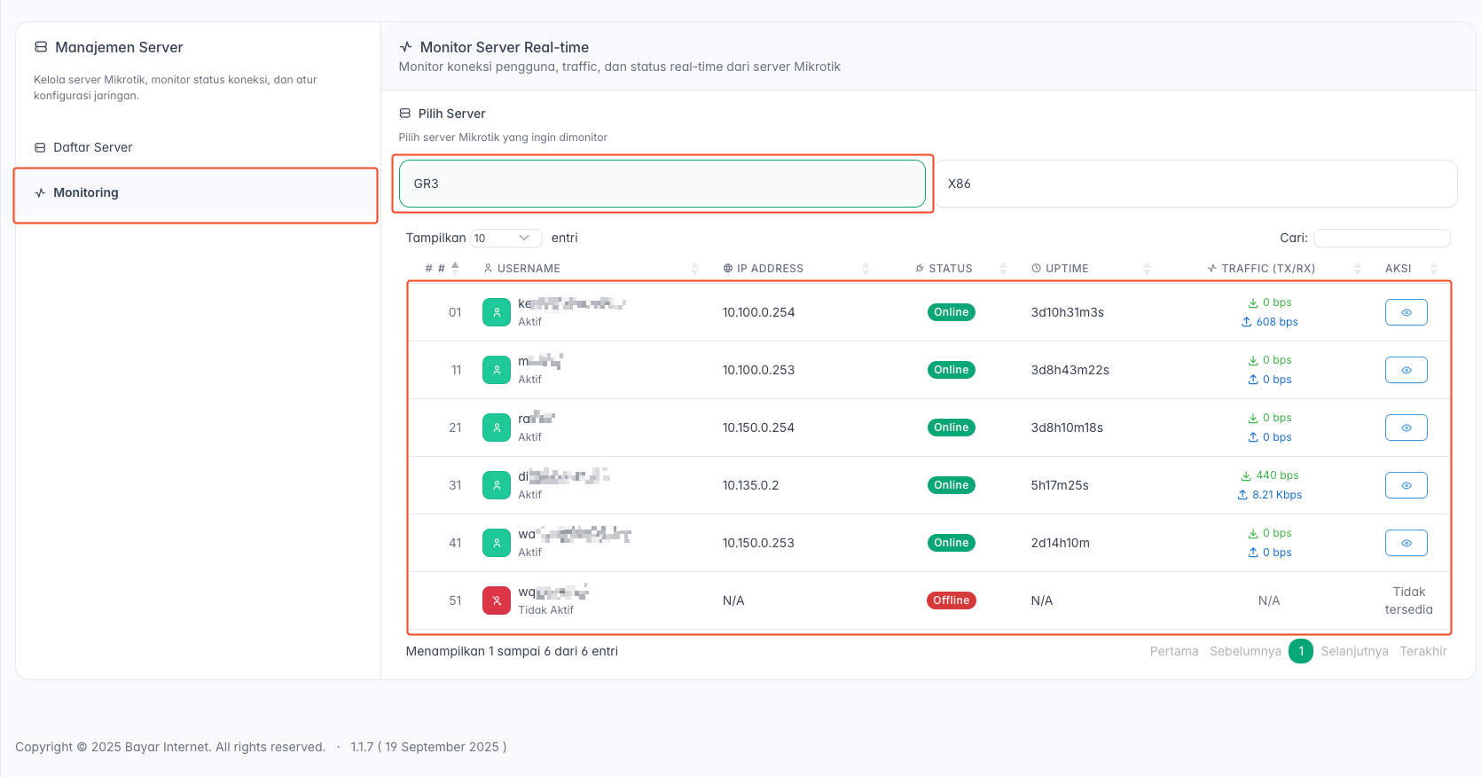 Dari menu utama, navigasikan ke Mikrotik Server, lalu klik tombol + Tambah Server.