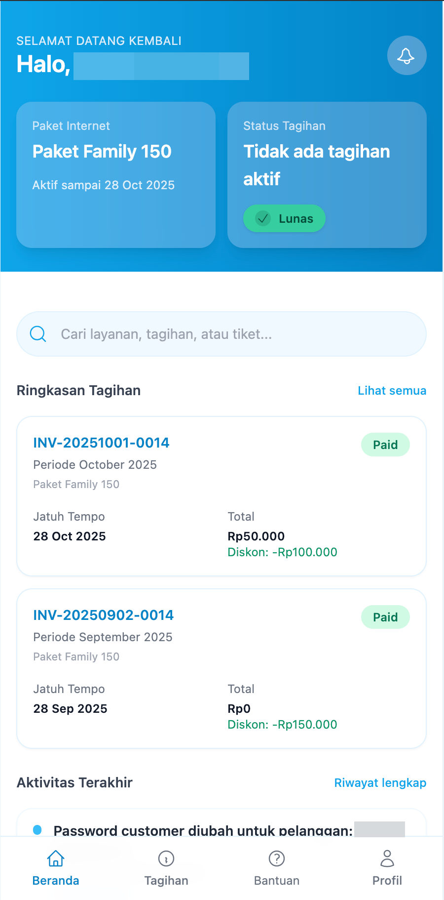 - Tagihan: Melihat daftar lengkap semua invoice (lunas dan belum dibayar) serta melakukan pembayaran.