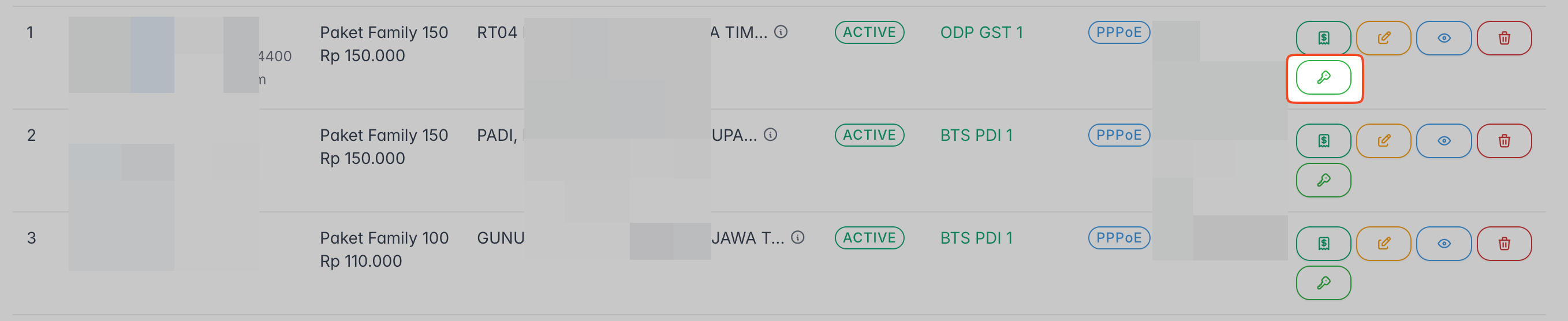 Cari dan identifikasi pelanggan yang memerlukan akses portal. Pada kolom Action di baris pelanggan tersebut, klik ikon kunci (Atur Password).
