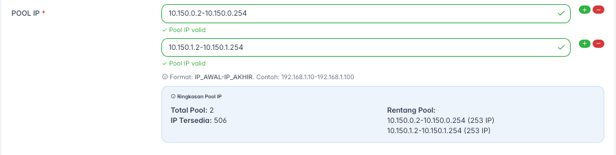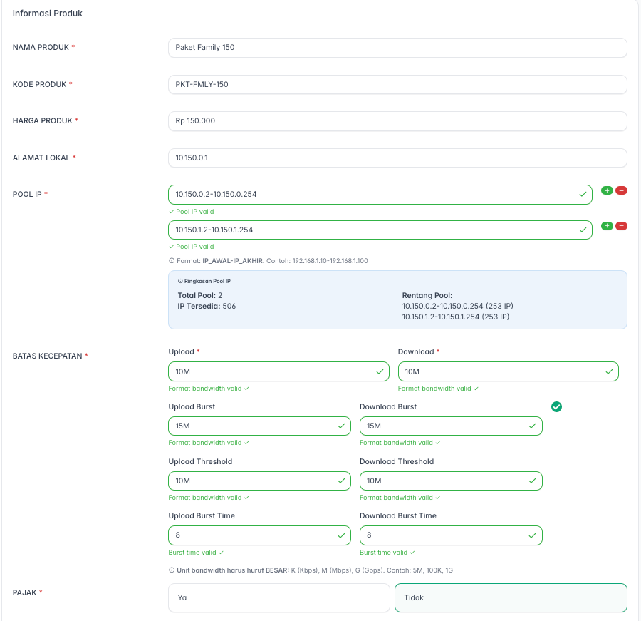 - Pool IP: Tentukan rentang (range) alamat IP yang akan dialokasikan untuk pelanggan yang menggunakan paket ini. Gunakan format