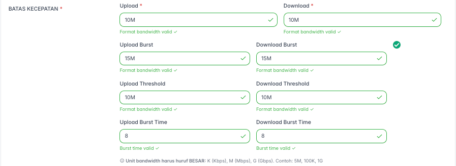 - Kolom lainnya (Upload/Download Burst, Threshold, Burst Time): Ini adalah pengaturan lanjutan untuk burst (lonjakan kecepatan sesaat) yang bisa Anda atur jika diperlukan.