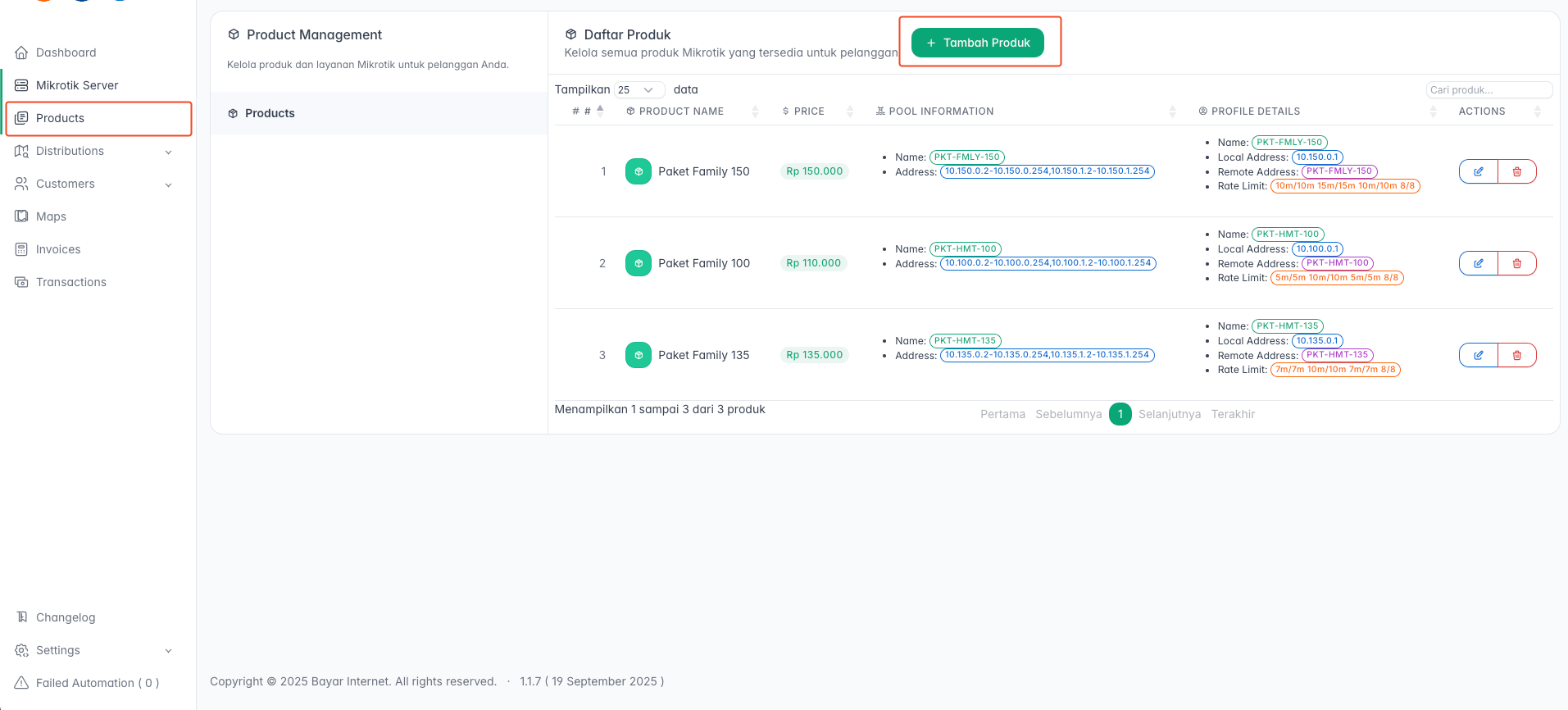 Modul Manajemen Produk digunakan untuk mengelola semua produk dan layanan Mikrotik yang akan ditawarkan kepada pelanggan. Di sini, Anda dapat menambahkan, melihat, dan mengelola paket internet.
