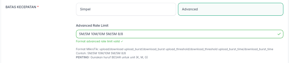 Opsi ini memungkinkan Anda mengatur rate limit dalam format teks tunggal sesuai standar Mikrotik.