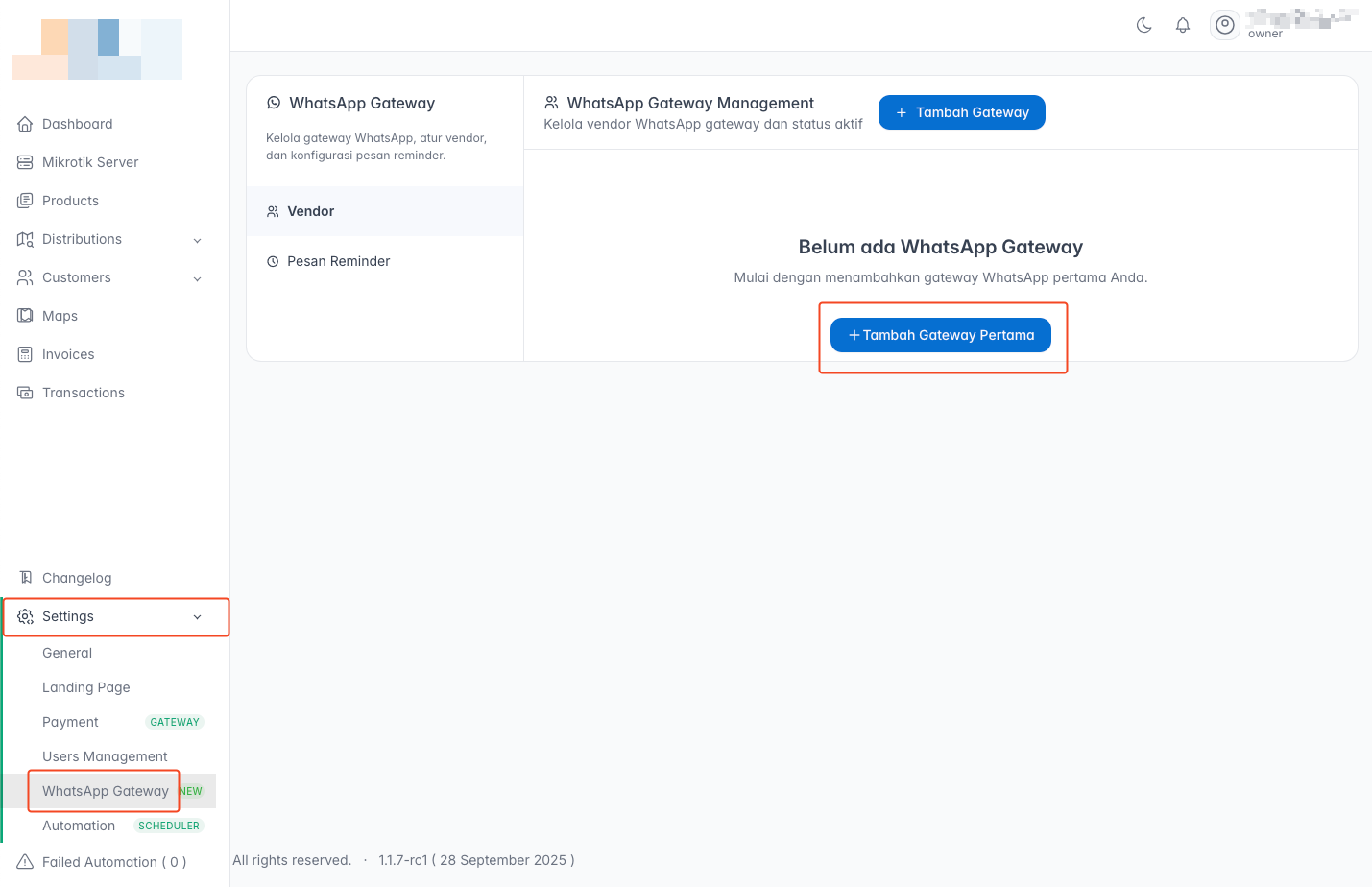 - Pilih submenu WhatsApp Gateway.