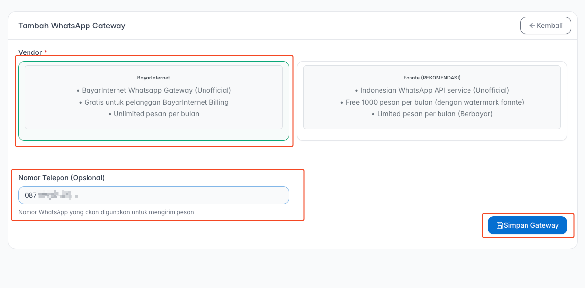 Sistem kami terintegrasi dengan dua penyedia (vendor) layanan WhatsApp Gateway yang dapat Anda pilih sesuai kebutuhan.