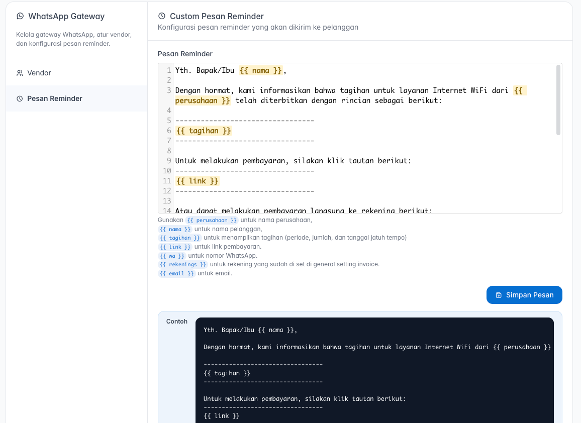 {{ nama }},{{ perusahaan }}, dan{{ tagihan }}untuk menyisipkan informasi secara otomatis. - Setelah selesai, klik Simpan Pesan.