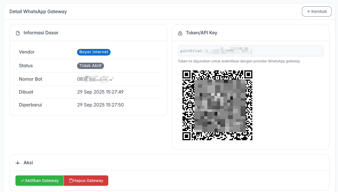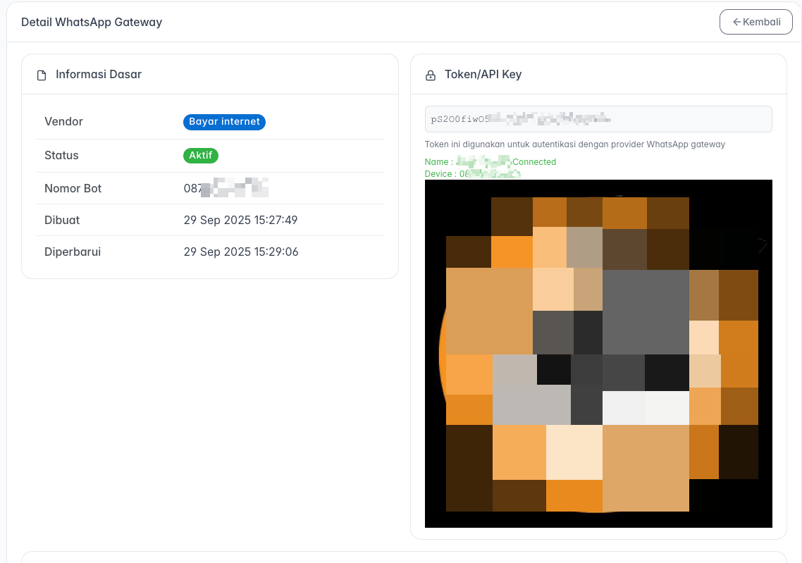 - Sistem akan secara otomatis menampilkan halaman Detail WhatsApp Gateway beserta sebuah Kode QR.