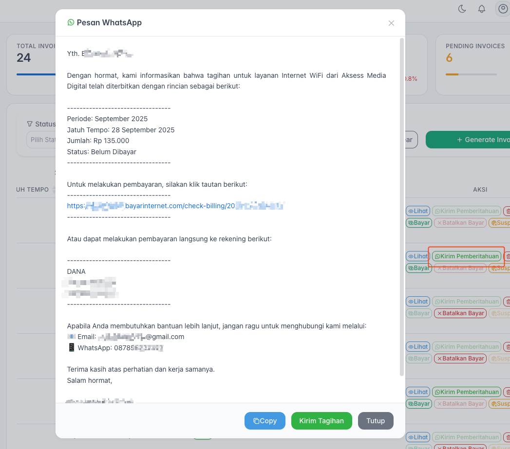 - Klik Kirim Tagihan untuk mengirim pesan tersebut ke pelanggan.